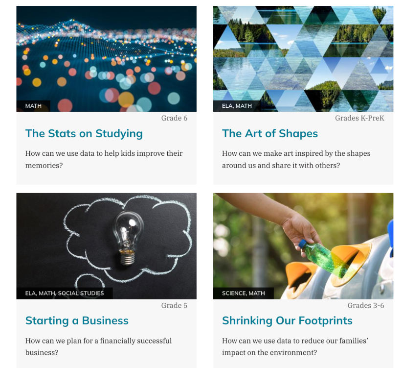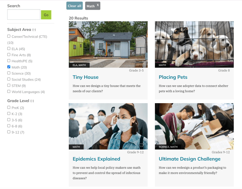 PBLWorks, formerly Buck Institute, is a leading project-based learning resource. PBLWorks is best known for their intensive workshops (you do have to pay for these) that teach how to use project-based learning in the classroom, but their website also provides example projects for free and many other PBL tips for best practices when implementing projects. They provide project ideas for all content, and the list of ideas is searchable by clicking the content area and age range that you are interested in. This website does not have any project-specific support resources like rubrics or daily lesson plans, but PBLWorks is in the process of working with teachers and researchers to build out a few mathematics projects with all of these supports for full implementation that will be available for a fee.